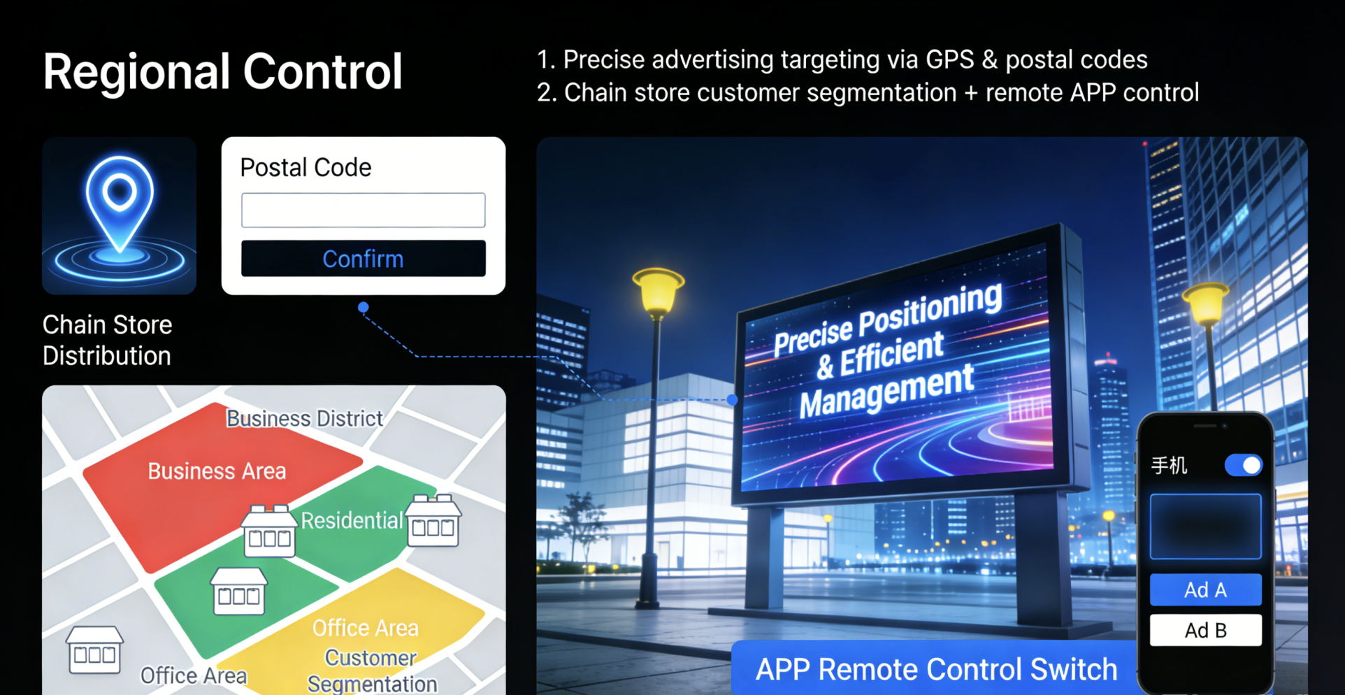 We achieve precise and efficient attraction of consumer groups by integrating AI-driven LED advertising screens with GPS and regionalized dynamic advertising placement, achieving a 10 to 100 times increase in effectiveness.